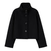 A structured short wool coat with a clean single-breasted design, wide stand collar and a relaxed silhouette. The smooth wool-blend outer and minimal detailing create a refined modern look suitable for both casual and office outfits throughout the cooler season.