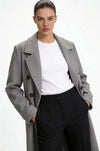 A longline wool coat with a clean, structured silhouette and a smooth, uniform finish. Made from a wool blend, it features a double-breasted front and a structured notched lapel. The coat offers full coverage for colder days and includes front flap pockets.