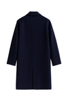 A long overcoat with a clean, structured silhouette and a smooth, uniform finish. It features a turn-down collar, single-breasted front with two buttons, and straight sleeves. The coat falls below the hips and includes simple side pockets. Shown worn open, it presents a minimal, smart look suitable for cooler days.